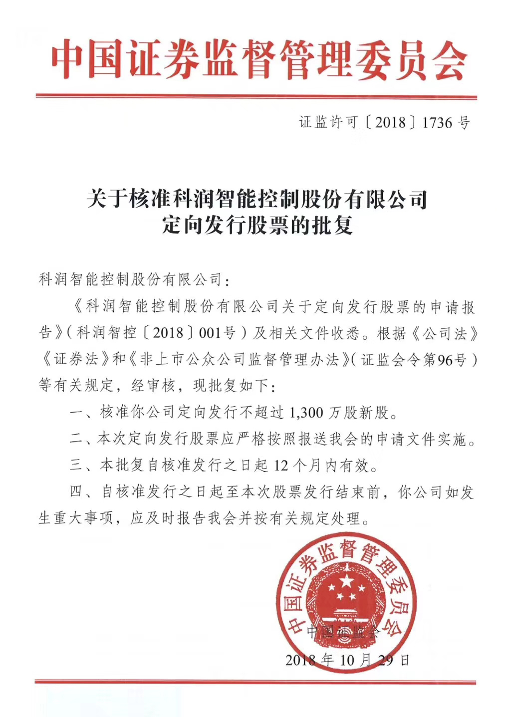 科潤獲證監(jiān)會“關(guān)于核準(zhǔn)定向發(fā)行股票的批復(fù)”。感謝所有關(guān)心與支持公司發(fā)展的各級領(lǐng)導(dǎo)和朋友,特別感謝證監(jiān)會,感謝投資機(jī)構(gòu)的信任,感謝江山市委、市政府的堅強領(lǐng)導(dǎo)。科潤團(tuán)隊定當(dāng)全力以赴、勇于擔(dān)當(dāng)、不忘初心、砥礪奮進(jìn),不辜負(fù)所有關(guān)心和支持科潤發(fā)展的領(lǐng)導(dǎo)、機(jī)構(gòu)和朋友的期望!