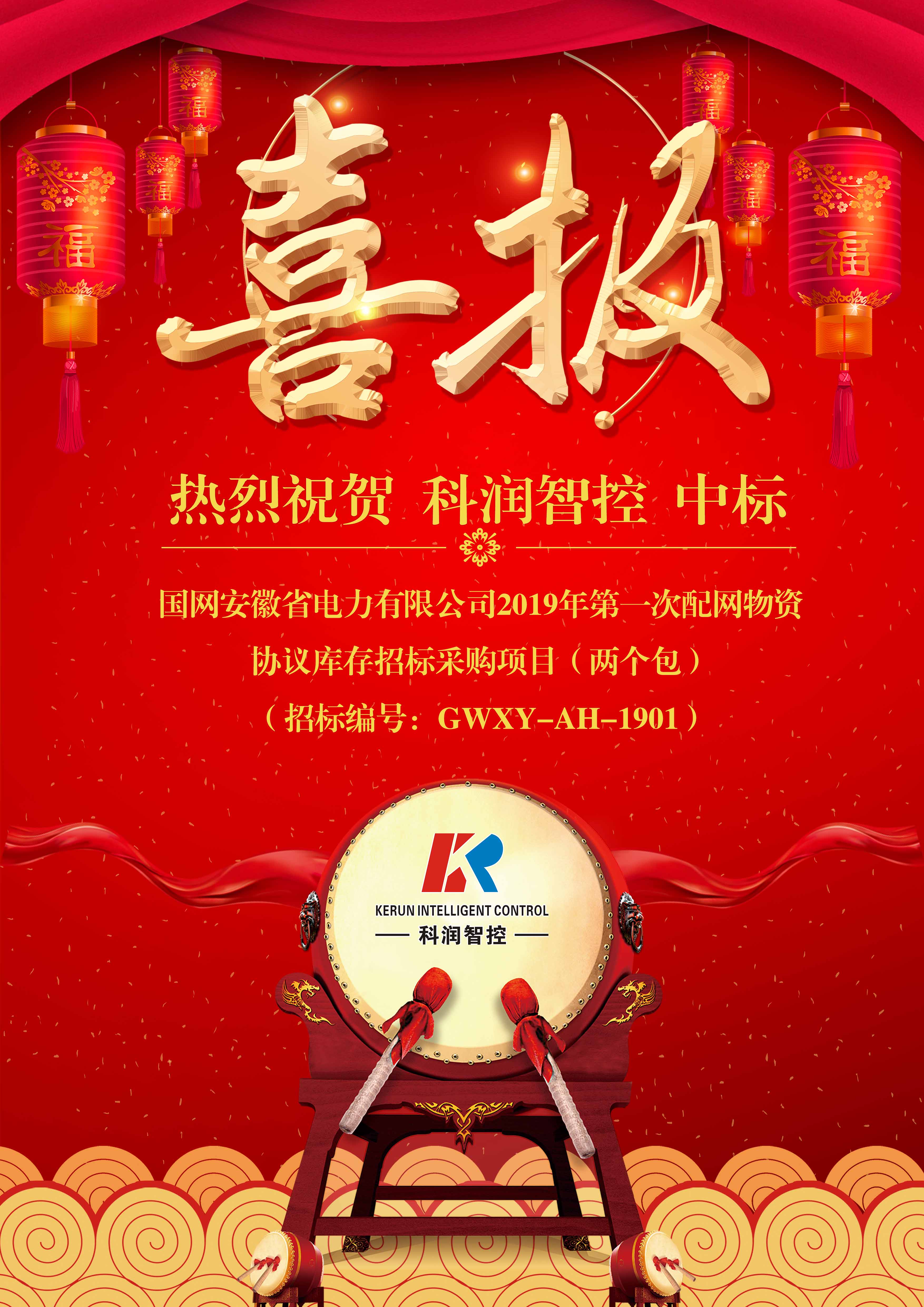熱烈祝賀科潤智能控制股份有限公司中標國網安徽省電力有限公司2019年第一次配網物資協議庫存招標采購項目(兩個包)(招標編號:GWXY-AH-1901)。