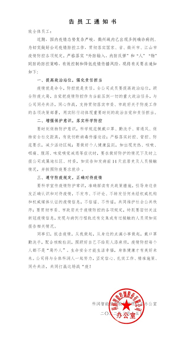 及時(shí)轉(zhuǎn)發(fā)衢州發(fā)布、江山發(fā)布等載體關(guān)于新型冠狀病毒防控常識(shí)、核酸檢測注意事項(xiàng)和最新疫情通報(bào)等,教育引導(dǎo)廣大員工以科學(xué)的態(tài)度認(rèn)識(shí)疫情,并發(fā)出告員工通知書,號(hào)召全體員工用實(shí)際行動(dòng),共同守護(hù)幸福家園,展現(xiàn)科潤智控全體員工的擔(dān)當(dāng)和力量。截止3月17日,公司全體員工已全部完成第一輪核酸檢測;對(duì)外來人員和車輛出入嚴(yán)格控制,要求正確佩戴口罩、掃碼、測溫、消毒、登記、查看48小時(shí)核酸報(bào)告;公司全域消毒;食堂錯(cuò)時(shí)就餐,排隊(duì)間距控制在一米等。